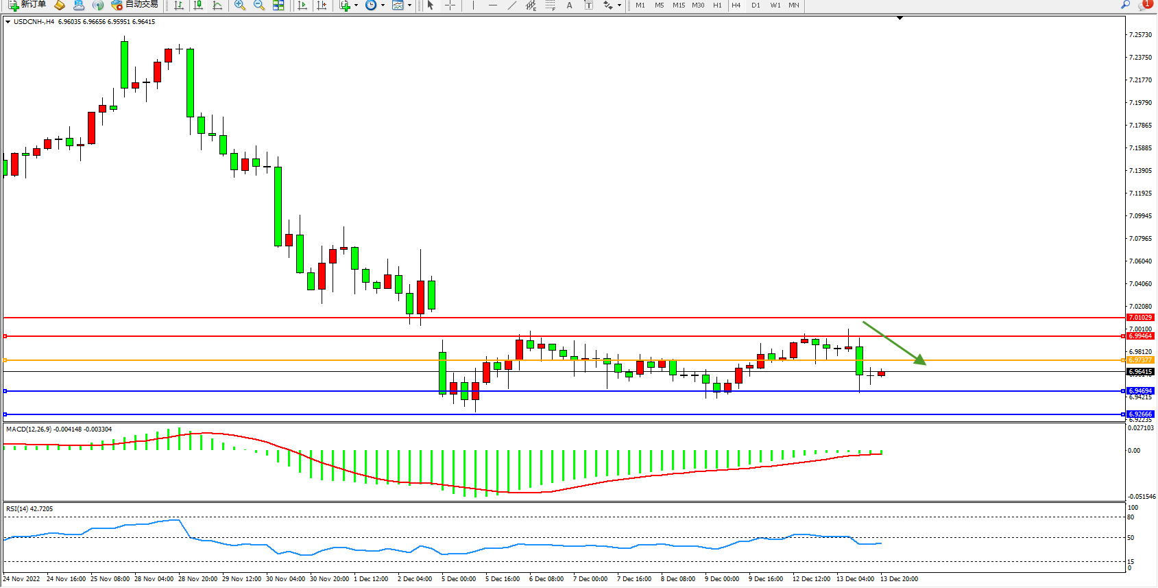 交易策略:6.97377下方看跌,目标6.94694、6.92666