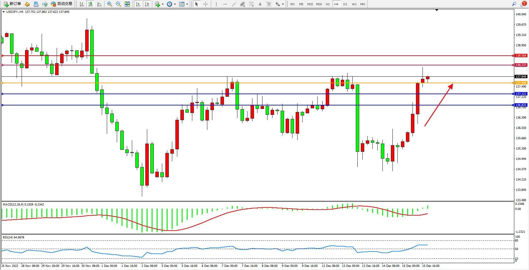 4小时图看:多头动力强势拉升,短期看涨情绪持续,市场整体处于多头上扬状态,MACD指标出0轴线上側徘徊,RSI指标处于50均衡线上側整理;