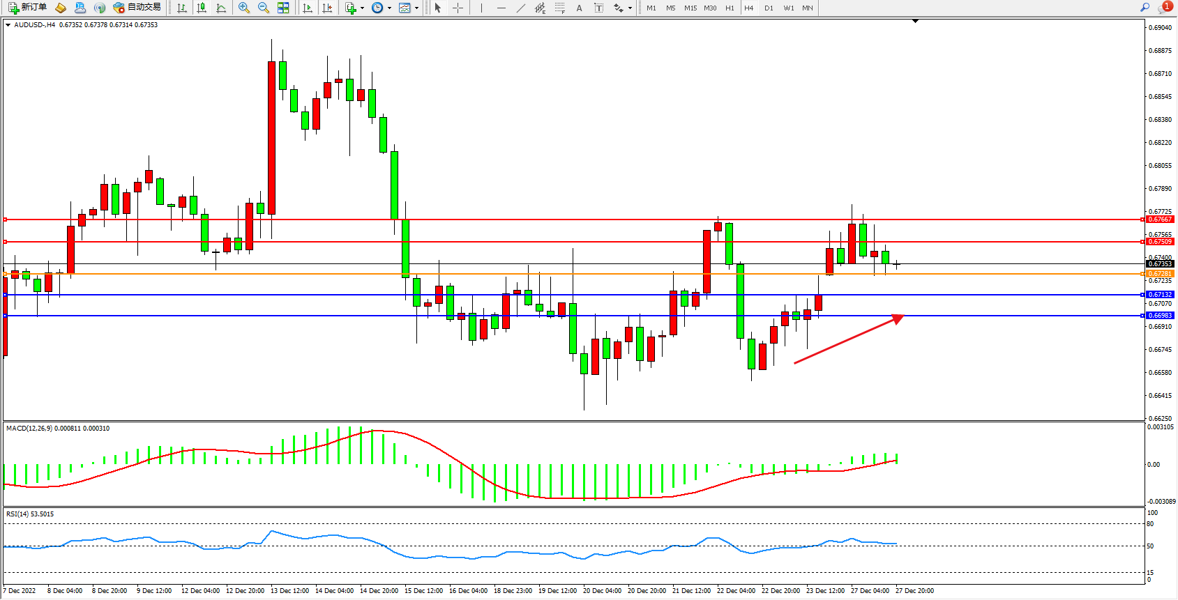 交易策略:0.67281上方看涨,目标0.67509、0.67667