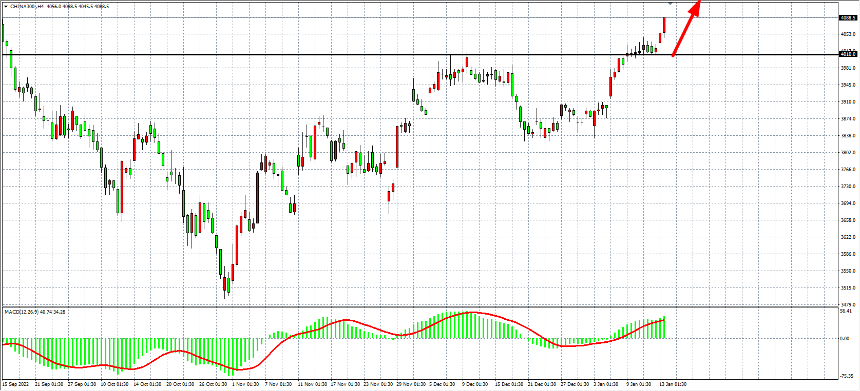 4小时图看,沪深300在4000点之上持续走强,同时MACD量能在零轴之上继续呈现放量状态,上行趋势加速,当前支撑已上移4010附近,上方目标看4100-4150附近。