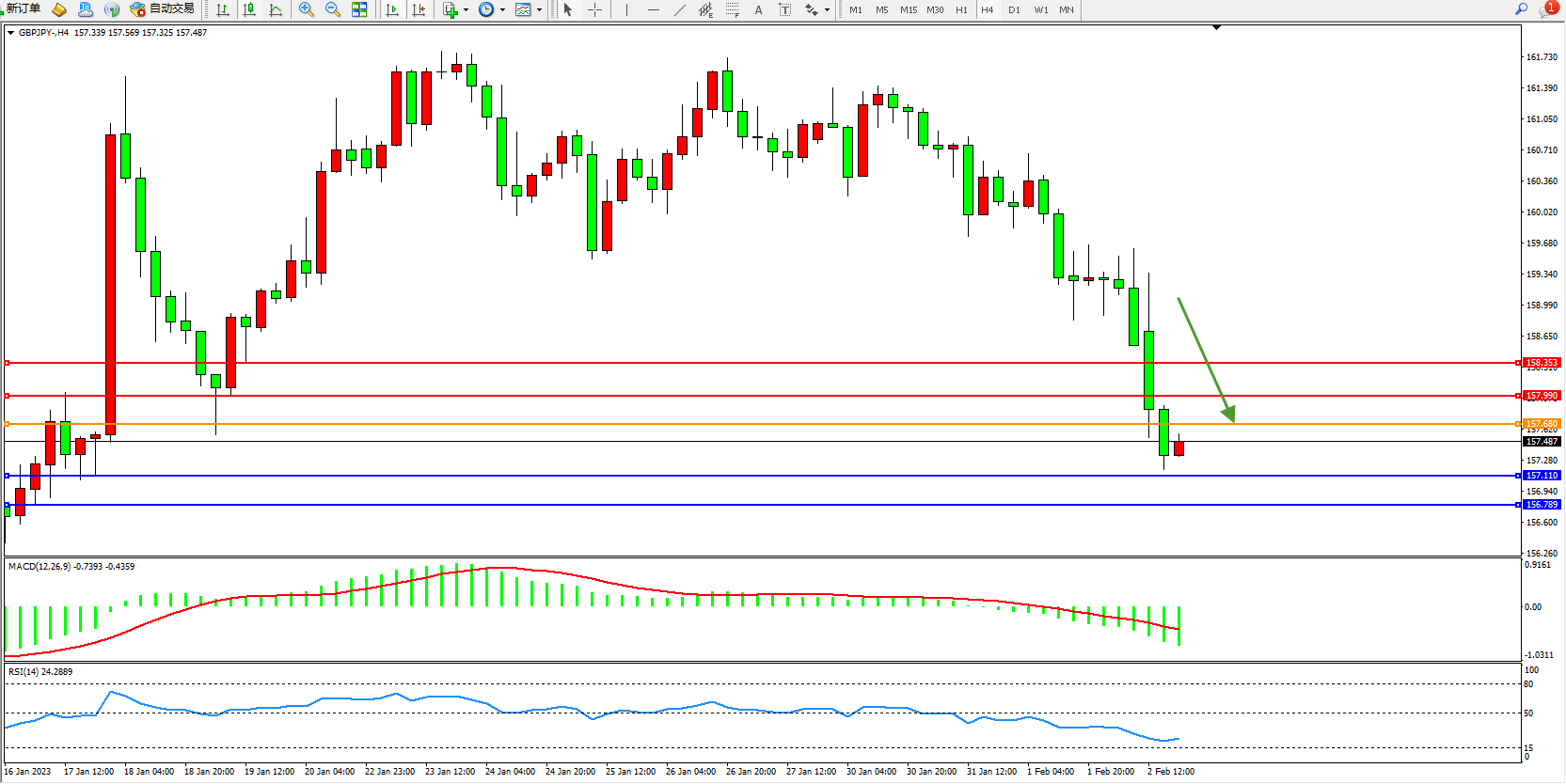 英镑兑日圆维持157.487附近震荡,英国央行将基准利率上调0.5个百分点,至4%。这一举措符合金融市场和经济学家的预期,使利率达到2008年以来的最高水平。