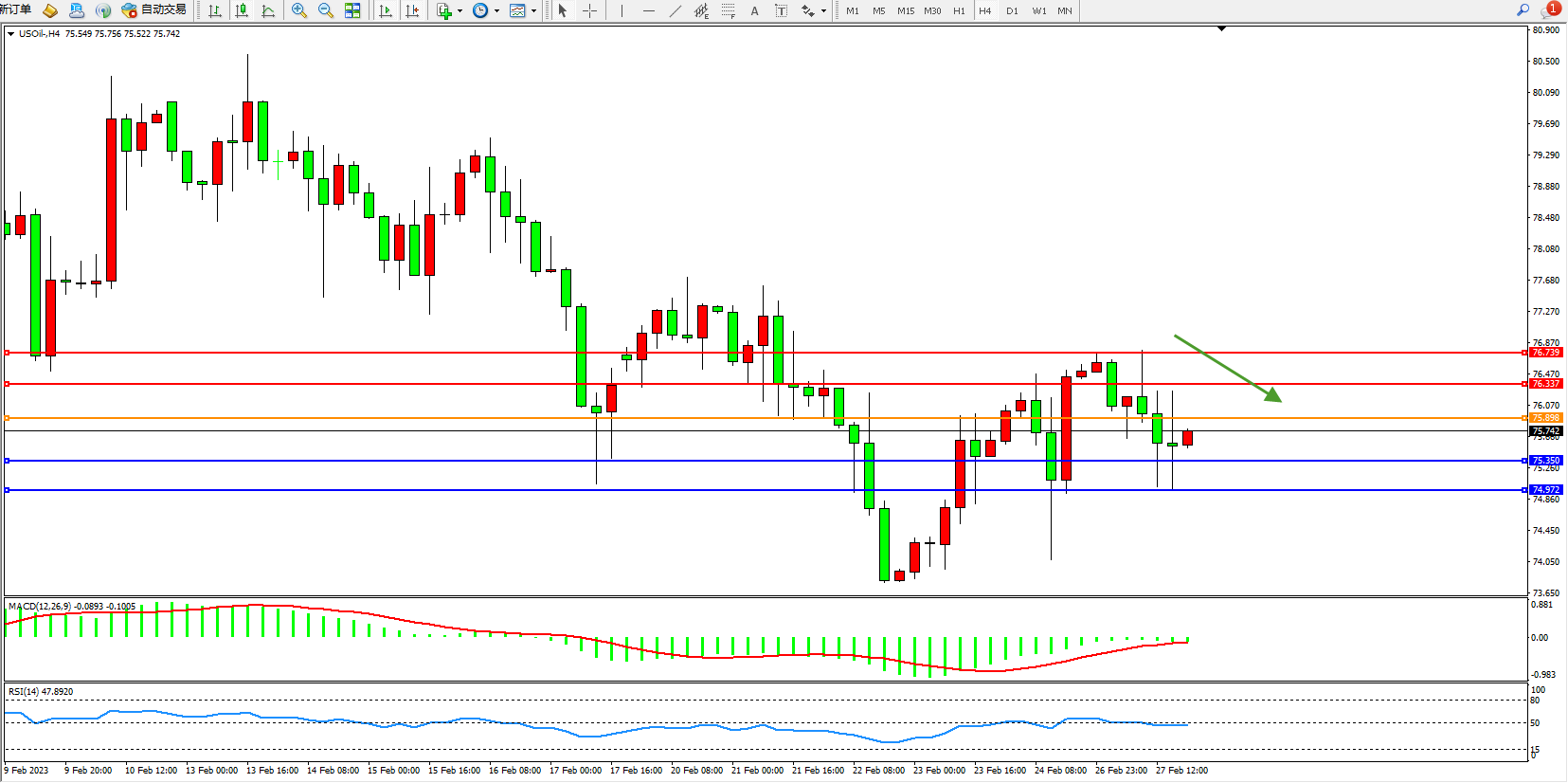 原油维持75.742附近震荡,由于俄罗斯计划在3月份将西部港口的石油出口削减至多25%,超过了其宣布的每日减产50万桶的计划。市场担心俄罗斯超计划减产。