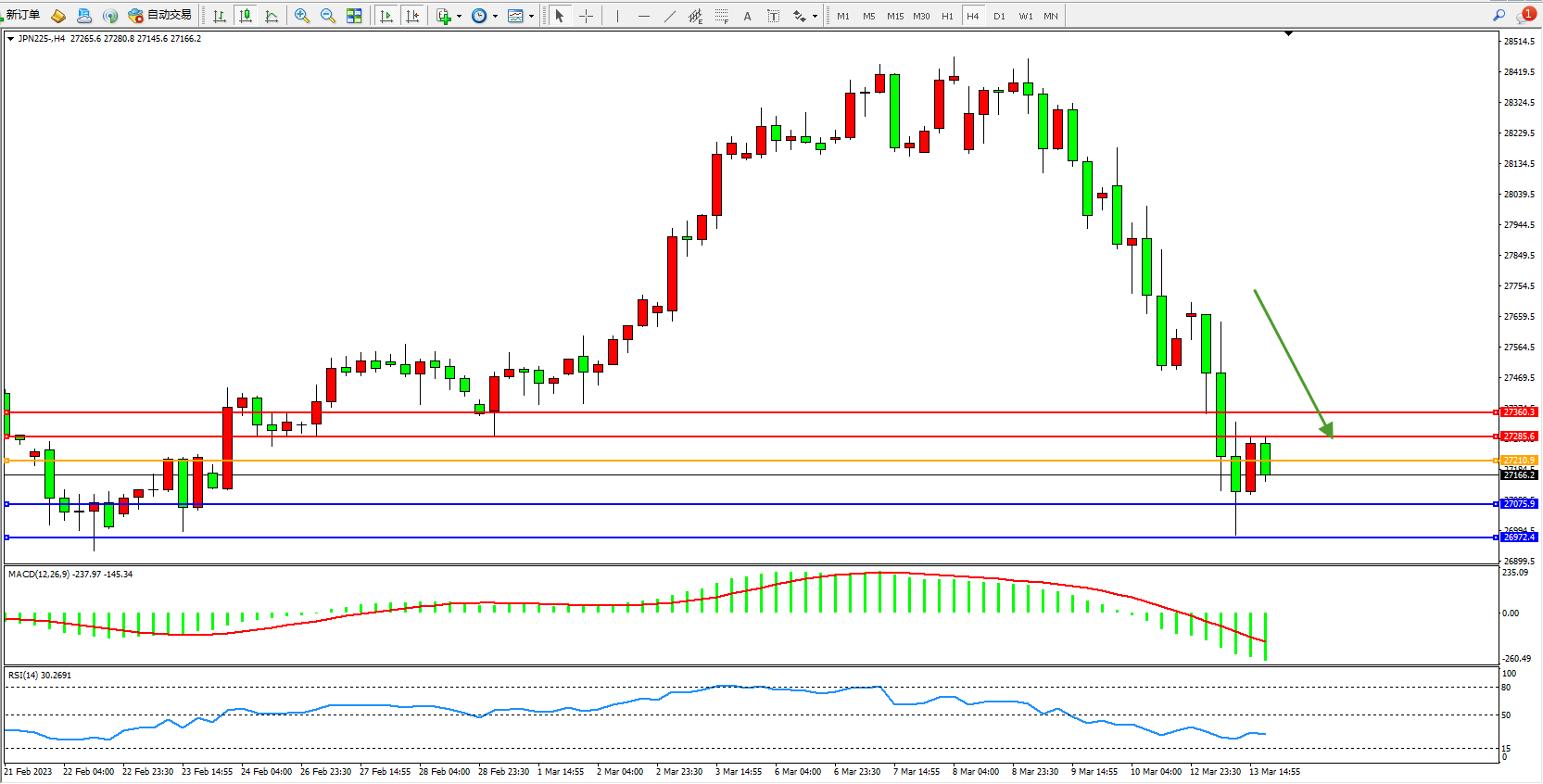 日经225指数3月13日(周一)收盘下跌294.47点,跌幅1.05%,报27849.50点。日本内阁官房长官松野博一:我不认为美国硅谷银行事件对日本的金融企业有太大影响。日本的金融机构有足够的流动性,资本基础总体良好。