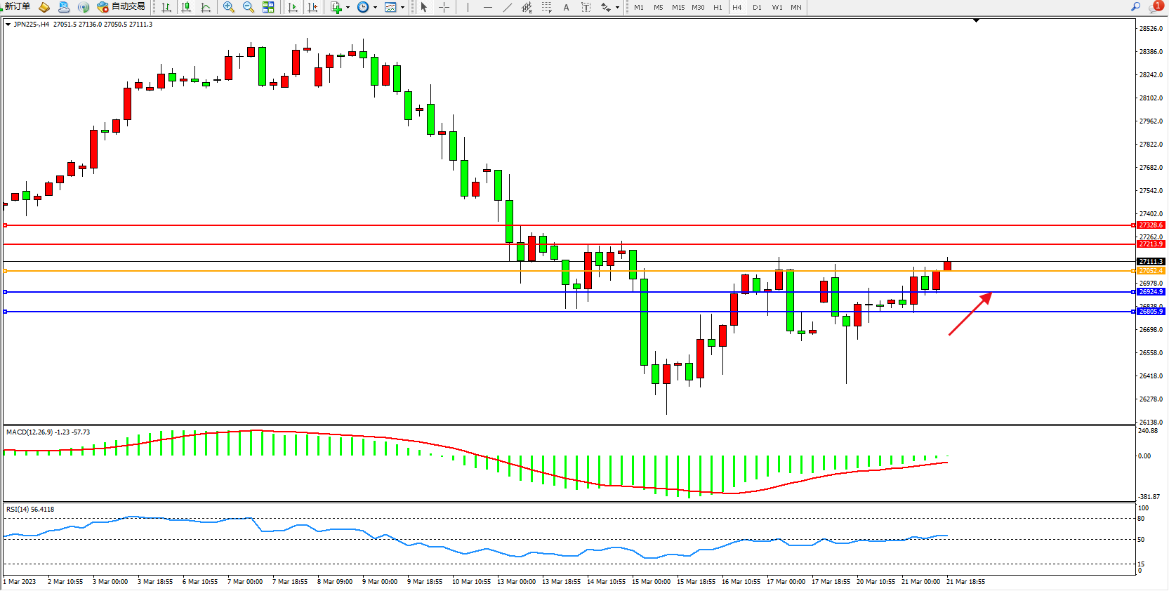 日经指数JPN225——4小时K线图显示: