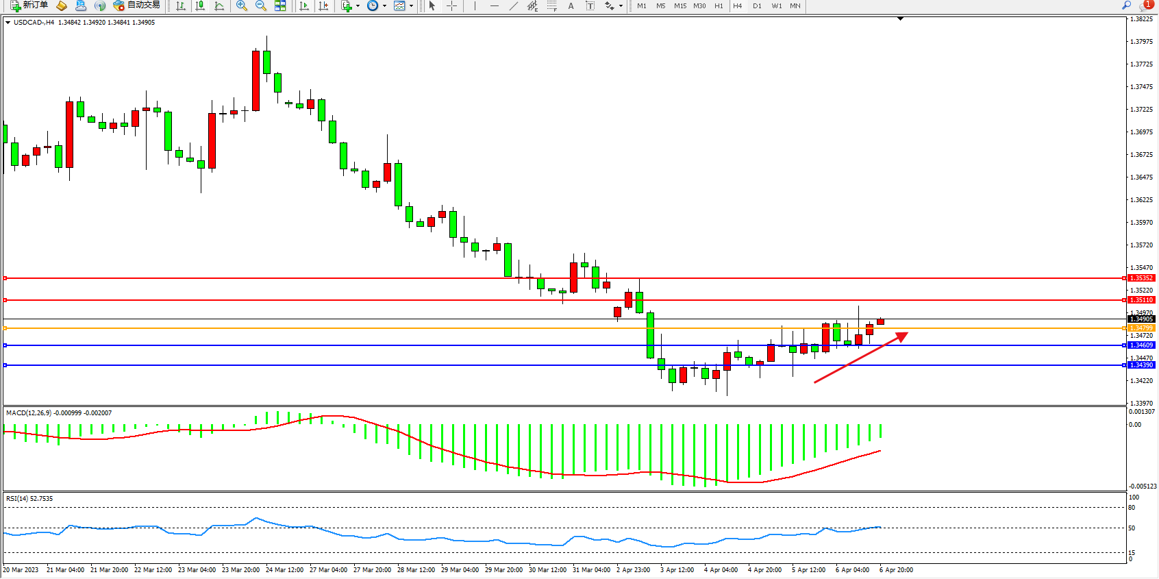 4小时图看:低位维持弱势缓慢上行,短期多头情绪开始缓慢涌现,市场多头动力逐渐向上移动中,MACD指标处于空头区域整理上行,RSI指标处于50均衡线下侧弱势徘徊;
