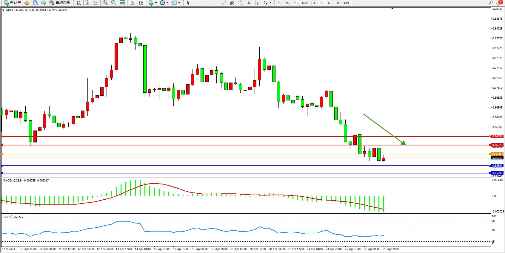 交易策略:0.66083下方看跌,目标0.65900 0.65790