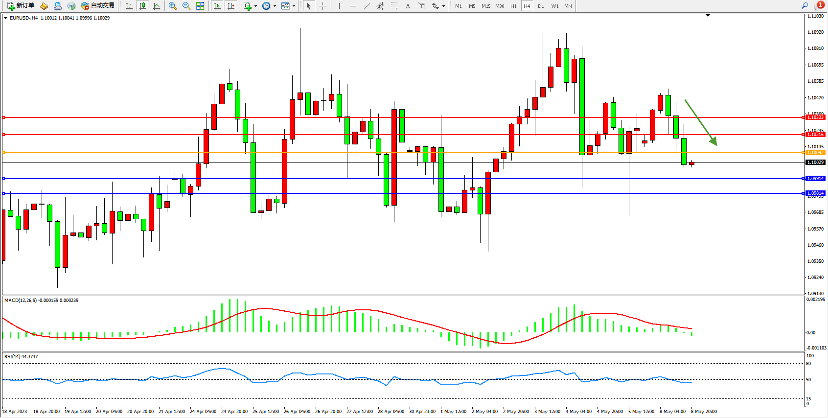 欧元美元EURUSD—4小时K线图显示: