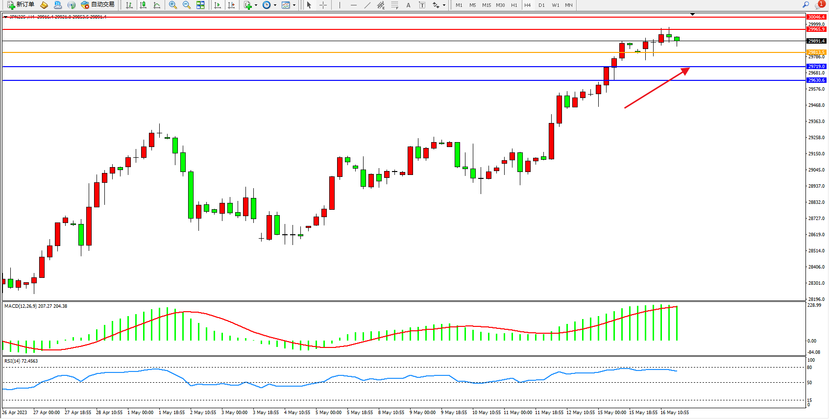 日经225指数5月16日(周二)收盘上涨222.16点,涨幅0.75%,报29848.50点。日本东证股价指数触及33年高位,芯片股追随纳斯达克指数隔夜涨势,对美国可能达成债务上限协议的乐观情绪进一步提振市场人气。