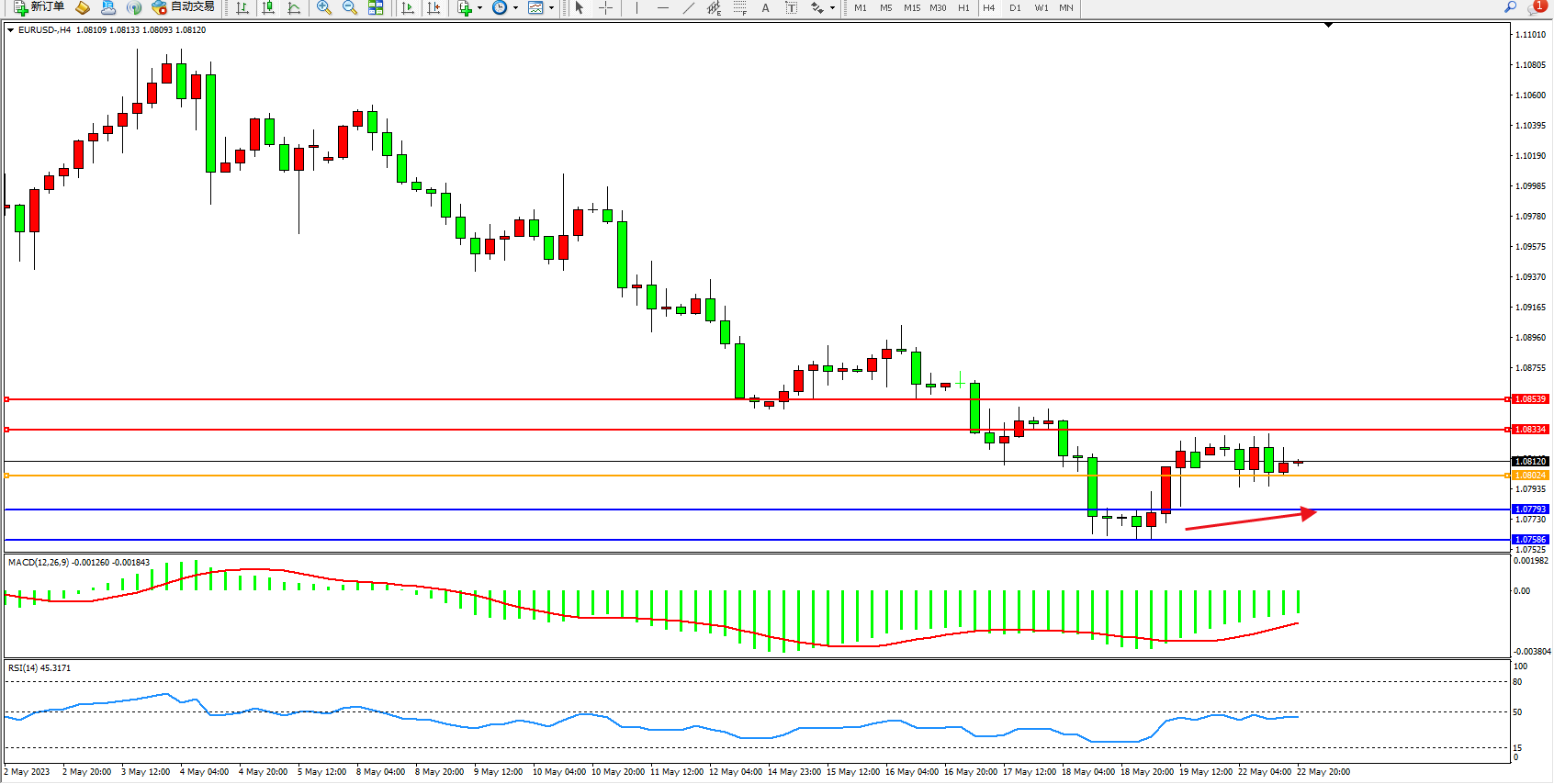 欧元美元EURUSD—4小时K线图显示: