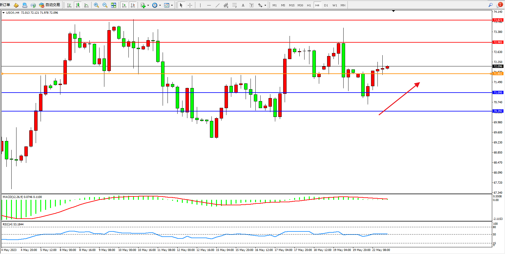 交易策略:71.802上方看涨,目标72.985  73.821