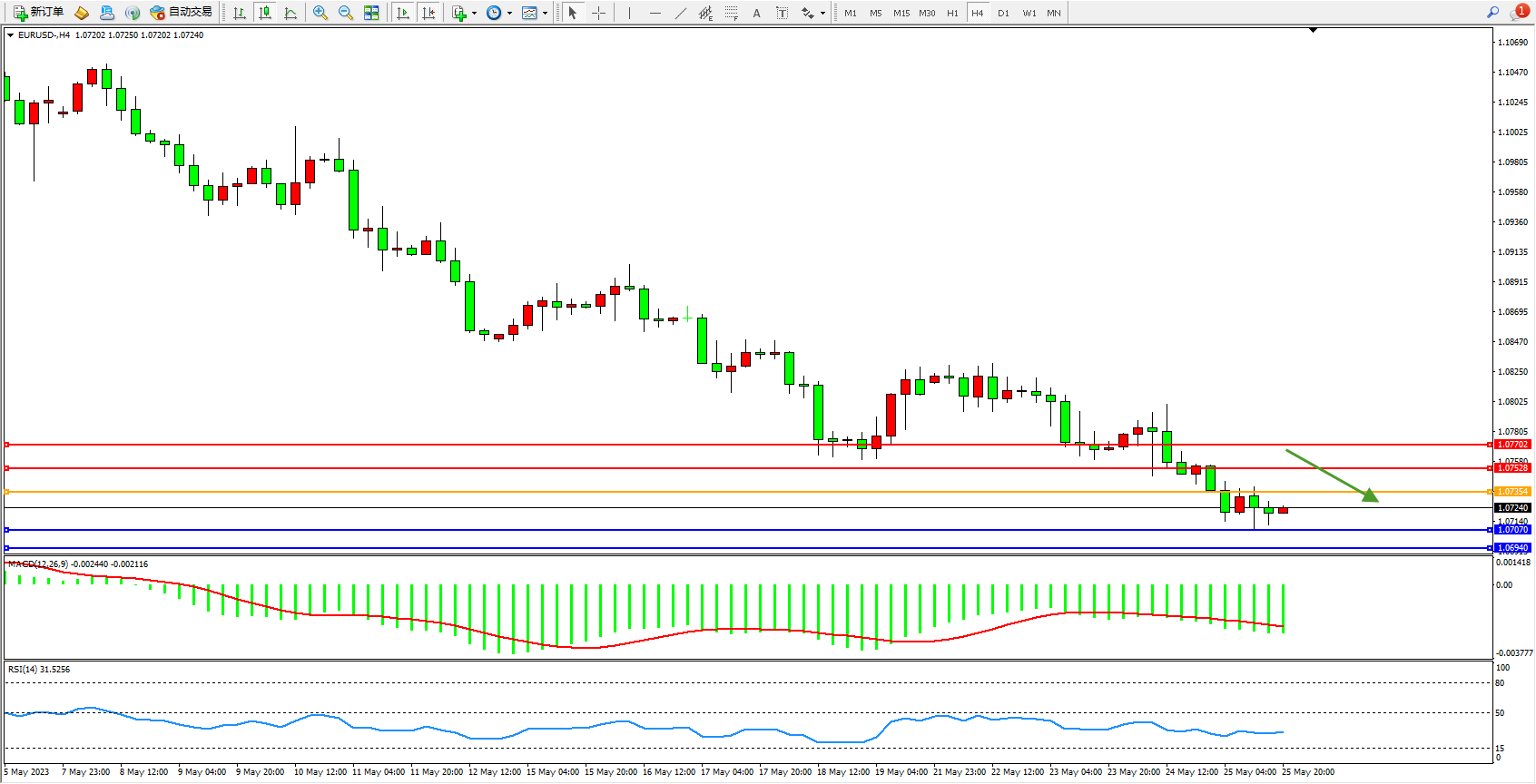 欧元美元EURUSD—4小时K线图显示: