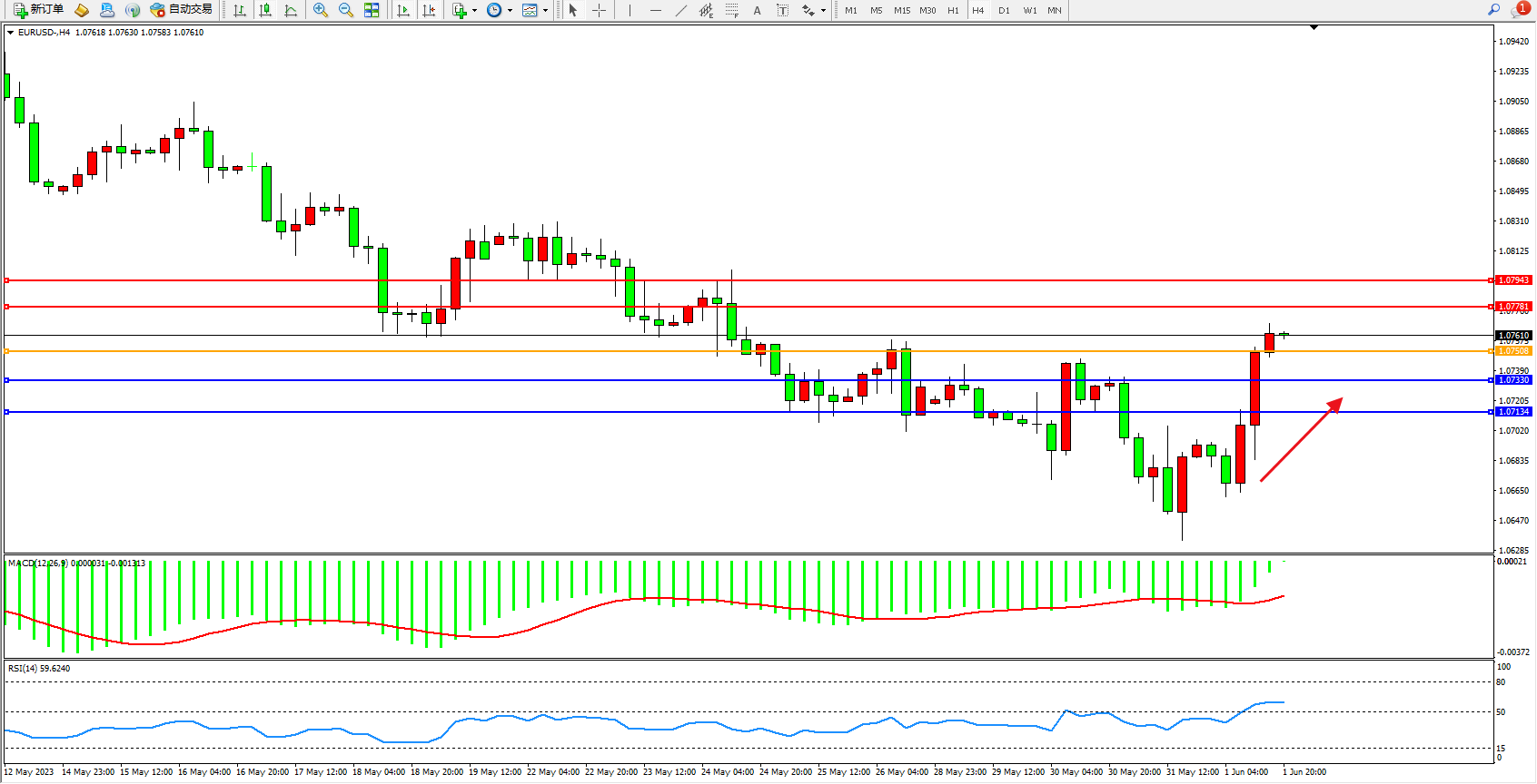 欧元美元EURUSD—4小时K线图显示: