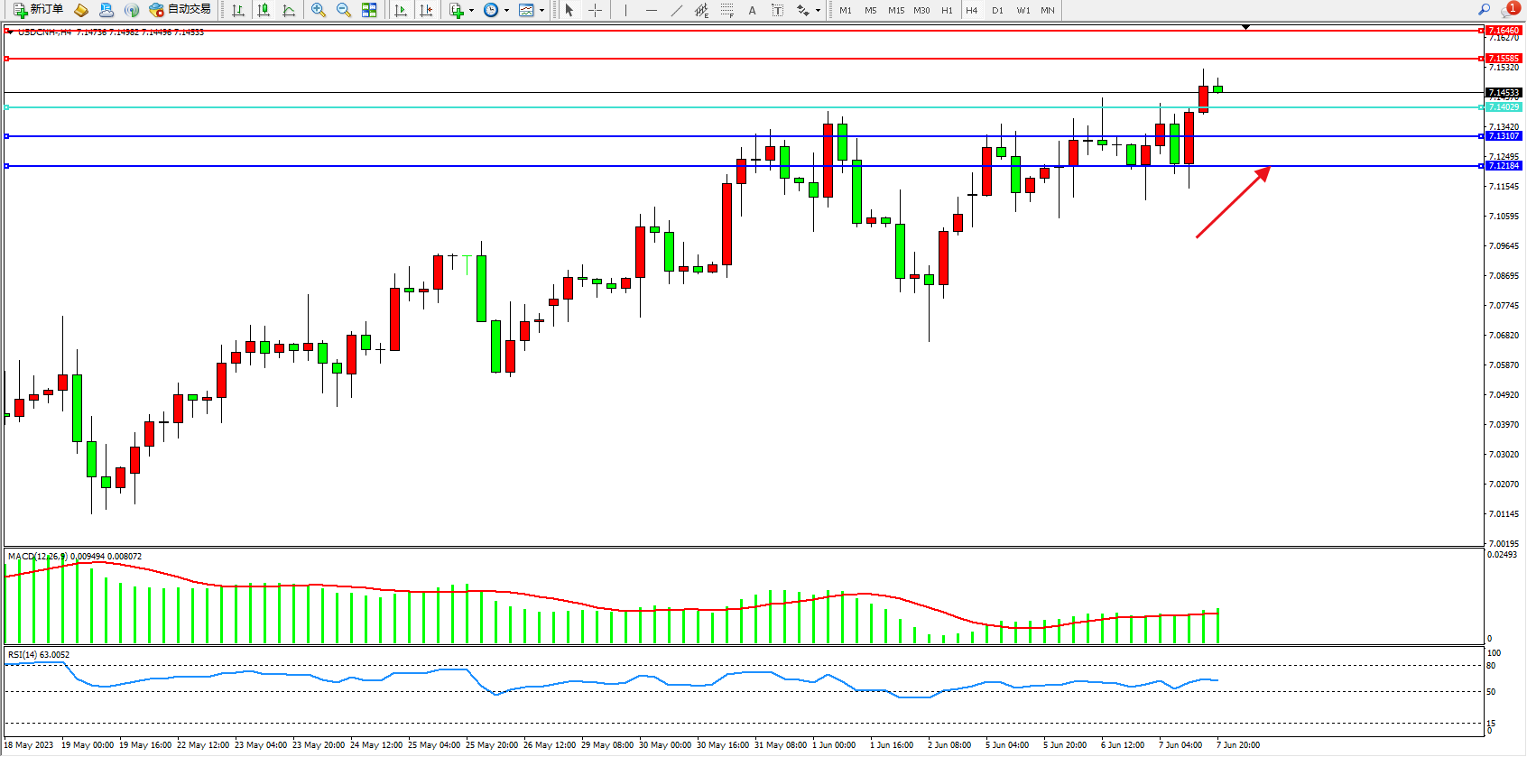 交易策略:7.14029上方看涨,目标7.15585  7.16460