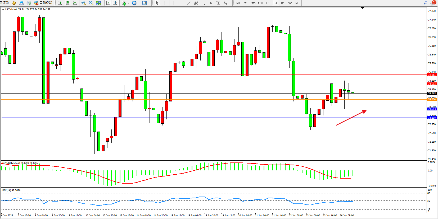布油维持74.265附近震荡,OPEC+最新减产和美国钻探商的谨慎态度,石油供应状况应该令人担忧。然而,由于央行货币政策引发的持续衰退预期,需求状况也令人担忧。