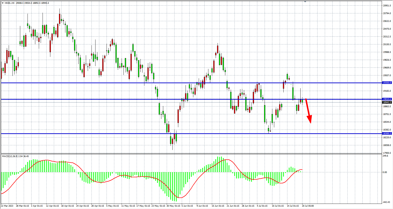 4小时图看,恒指反弹至19000关口再度受阻,MACD量能在零轴上缩量,继续关注19000关口阻力,该位之下看跌18500-18300。