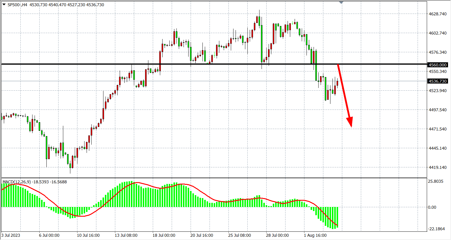 4小时图看,标普在4560之下走盘整,MACD量能下穿零轴,短线走势偏空,阻力关注4560-4600附近,下方支撑4500-4460。