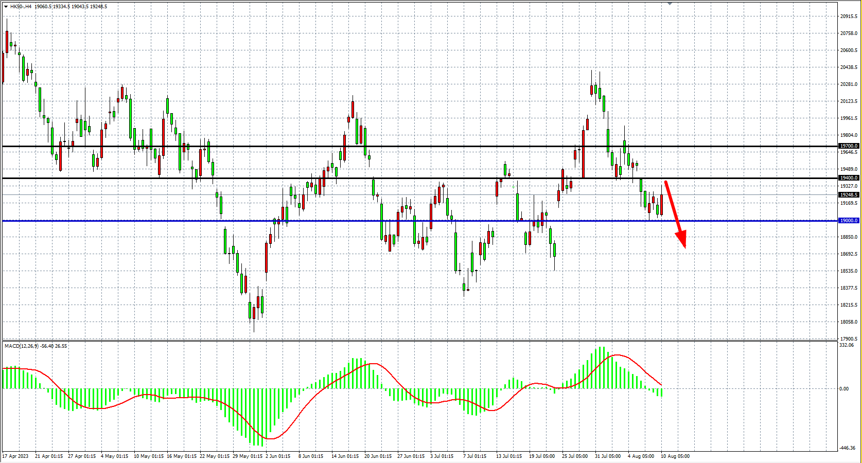 4小时图看,恒指在19000之上盘整,MACD量能下穿零轴,阻力关注19400,支撑关注19000附近。