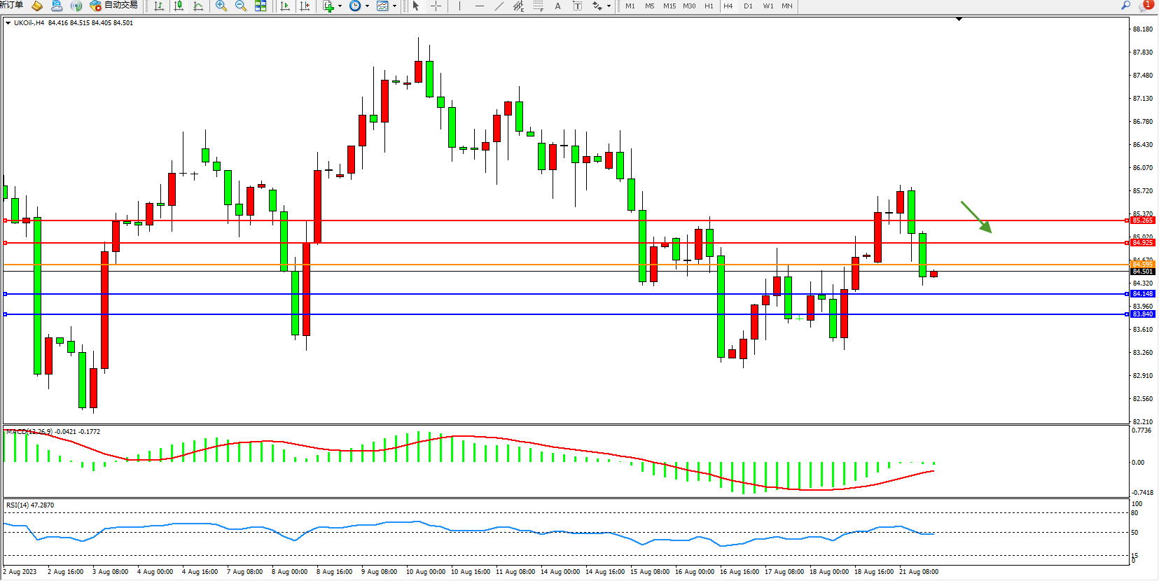 4小时图看:空头动力短期急速下跌,市场空头情绪笼罩,短期有继续向下移动迹象,MACD指标处于0轴线附近徘徊,RSI指标处于50均衡线附近整理;
