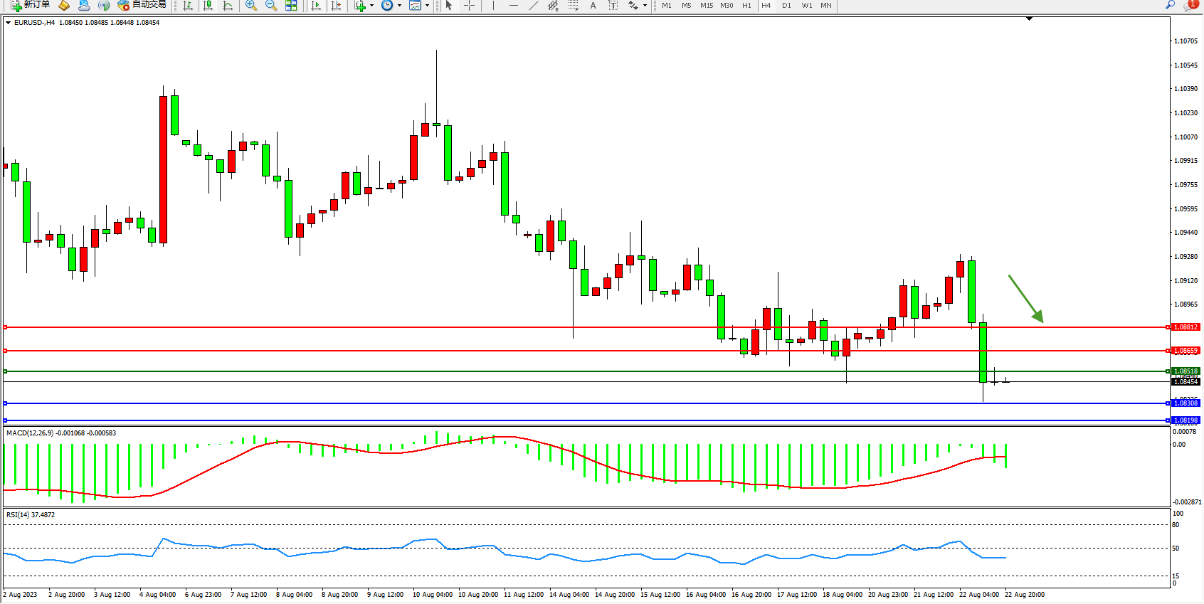 欧元美元EURUSD—4小时K线图显示: