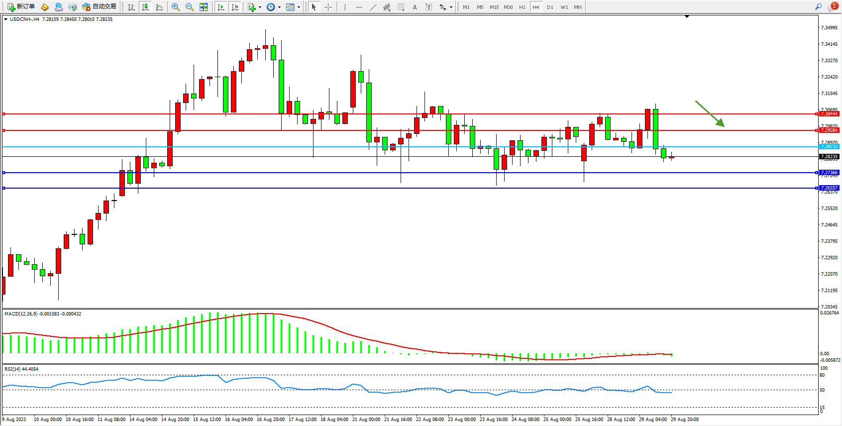 交易策略:7.28733下方看跌,目标7.27366 7.26557
