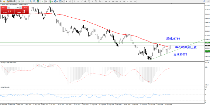 技术点评:日K线周期中,处于弱势下行,底部有短期支撑缓慢上行,上方压制位于26784附近,支撑25673附近,刚突破MA55均线压制上行MACD指标进入0轴上方,RSI指标在50均衡线出现上扬迹象。