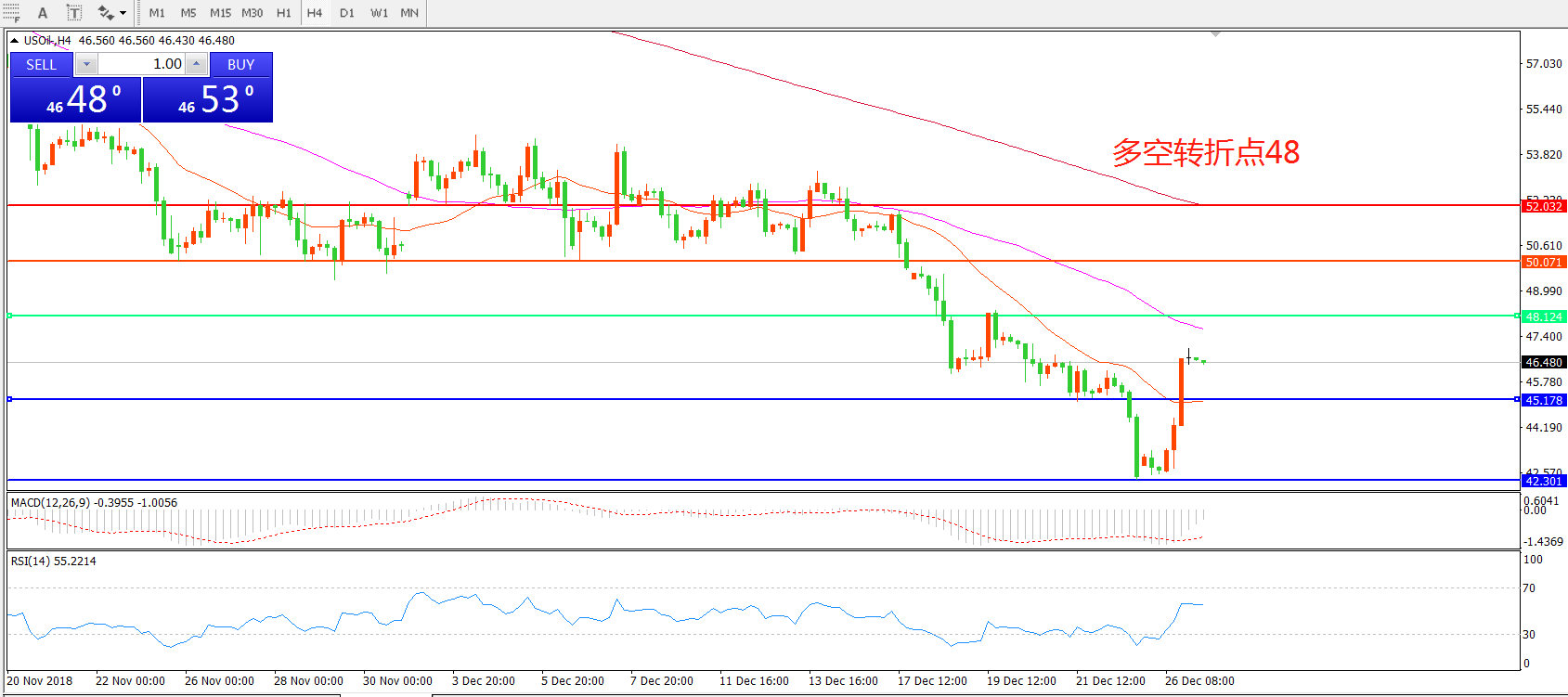 12月26日周三,WTI原油期货盘中一度站上46.40美元/桶,日内涨幅接近9.3%,创2016年11月以来最大单日涨幅,最终收涨8.68%,收报46.20美元/桶. 原油此前大跌受到美国政府关门、国际贸易争端和济增长担忧的共同影响。而周三油价反弹更多是则对下跌过快的一次修正,而非反转。