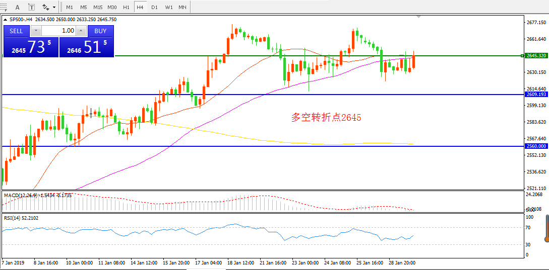 4小时图看,SP500跌破55周期均线下行,MACD红柱缩短,RSI指标延续下行,短期内如无力收复,下行调整仍将继续。