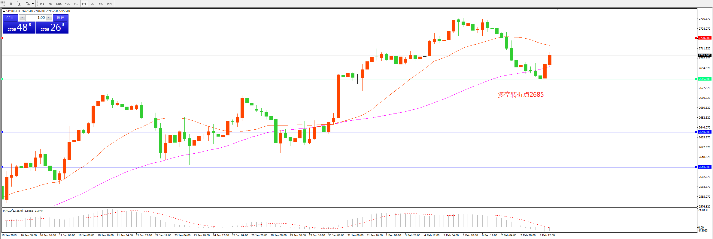 4小时图看,SP500逐渐站稳55周期均线,宽幅震荡格局明显。MACD红柱缩短,短期回落风险存在,下方支撑附近可逢低做多。