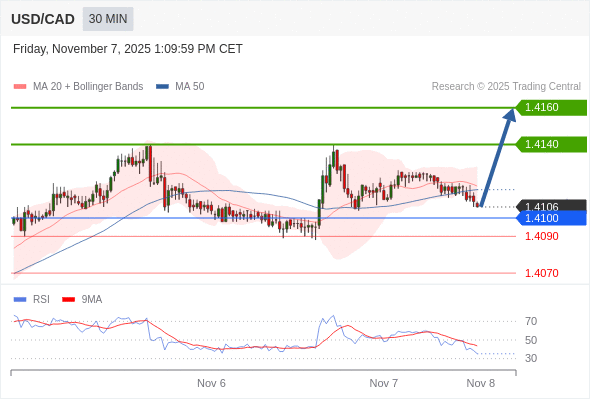 在 1.4100 之上,看涨,目标价位为 1.4140 ,然后为 1.4160 。