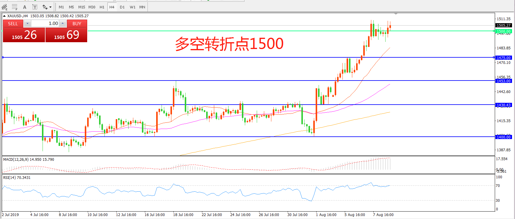4小时图看,金价长阳连续拉升,整体表现强势,目前已经站稳1500关口,均线系统呈多头排列,MACD红柱增加,RSI指标向上,中期走势仍然偏多。
