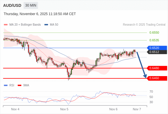 在 0.6520 之下,看跌,目标价位为 0.6480 ,然后为 0.6460 。