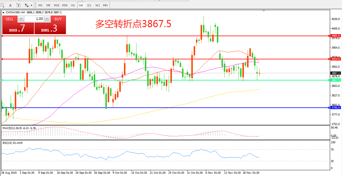 4小时图看,沪深300震荡下行,再次回到3867.5附近,整体走势偏弱,均线系统走平,21均线有下穿形成死叉迹象,MACD红柱减少,RSI指标走平上,日内延续震荡的概率较大。