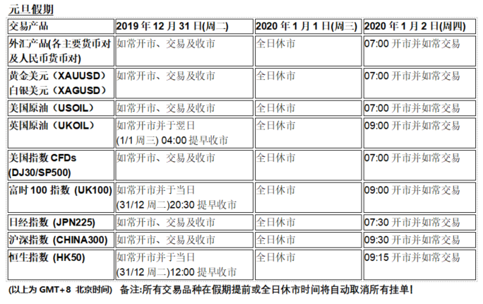 由于各地市场圣诞节假期及元旦假期影响,以下产品的交易时间将于2019年12月24日(周二)至12月27日(周五)以及2019年12月31日(周二)至2019年1月2日(周四)期间提前或全日休市,敬请留意!