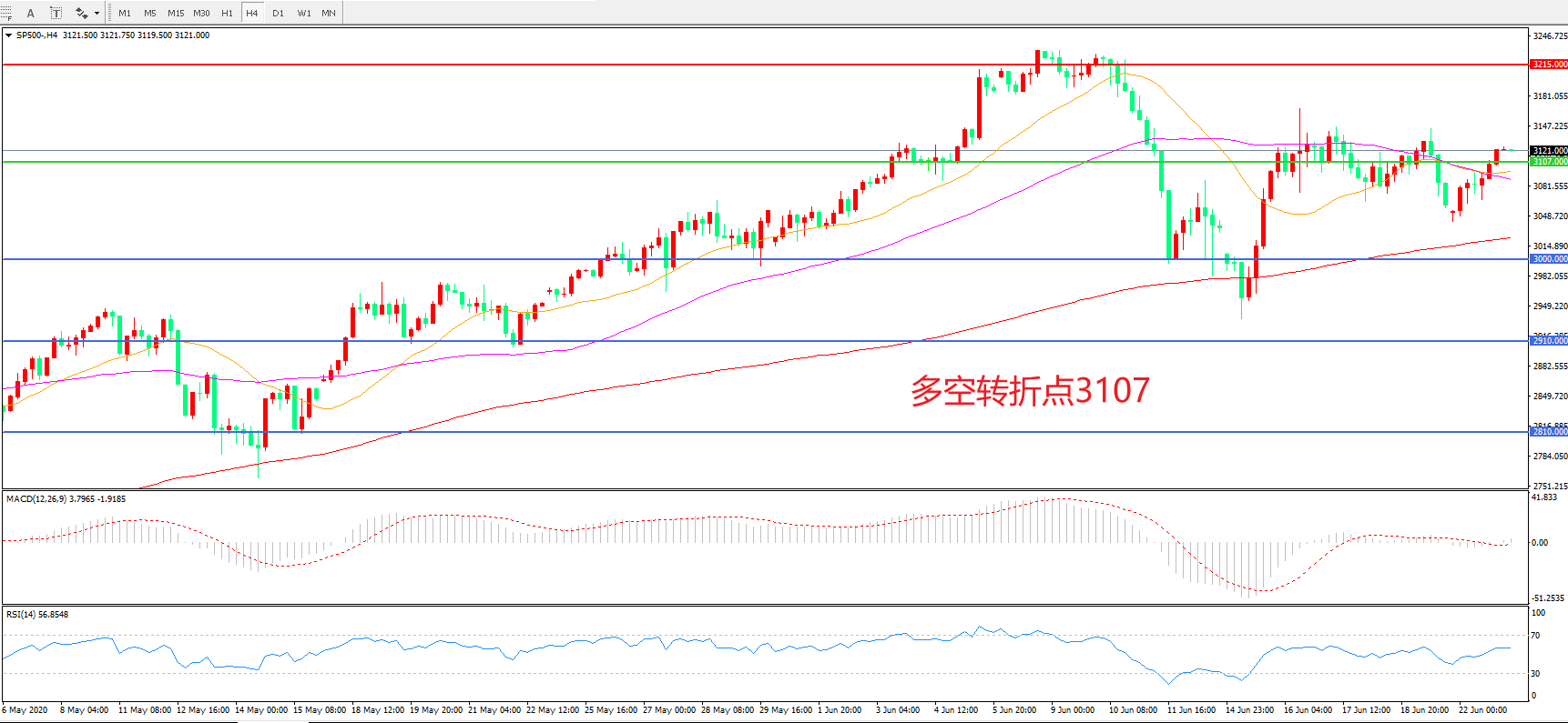 4小时图看,标普500震荡反弹,短期走势有所回暖,均线系统阻力被突破,MACD红柱增加,RSI指标向下,日内延续震荡概率较大。