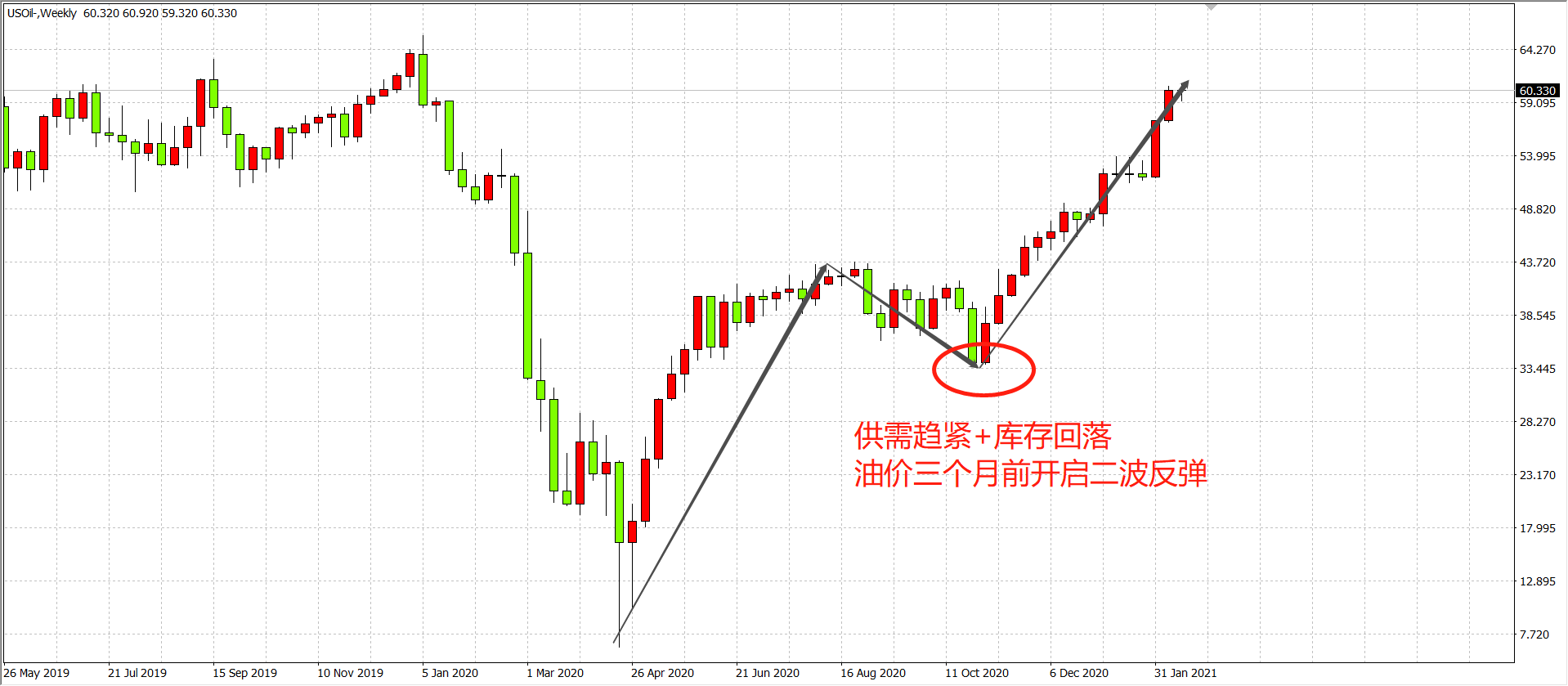 恰逢一年一度的中国春节,原油送上大礼包,大年初一美油布油双双突破60美元关口,一扫2020年大跌的阴霾,成为新的一年里表现最强劲、最值得期待的交易品种。