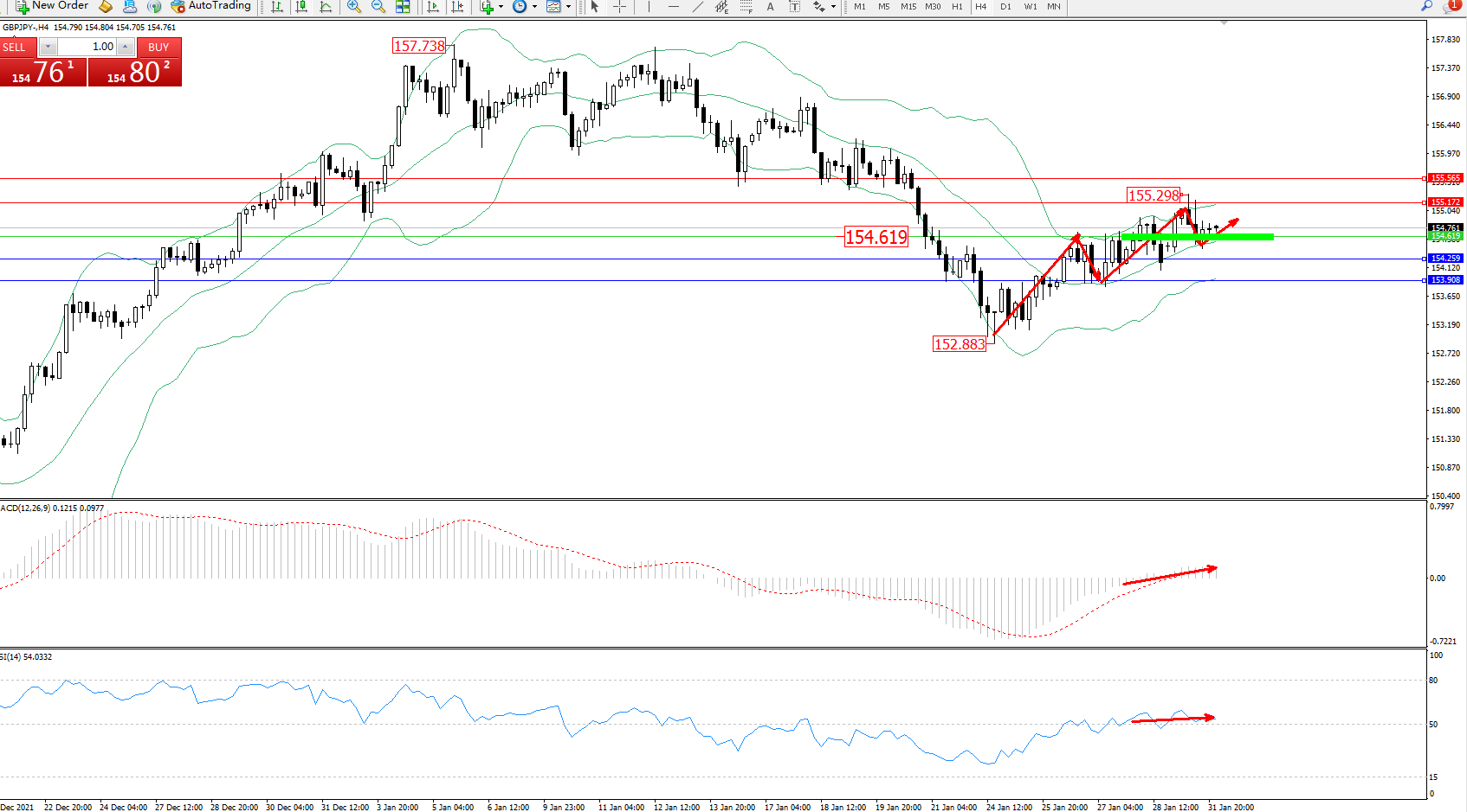 备选策略:154.619下方看跌,目标154.259、153.908