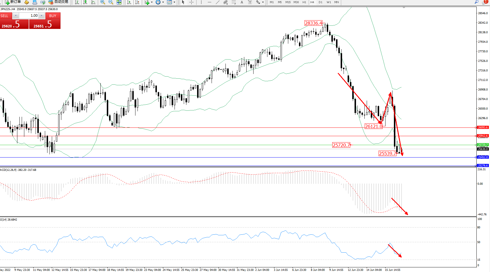 技术点评:空头动力延续布林带指标下轨附近持续震荡下挫,低位抵达25539附近节点后开始震荡,短期空头动力有继续下行态势,布林带指标呈张口走势持续中,MACD指标处于空头区域维持震荡不断下移,RSI指标处于空头区域持续震荡下行后整理;
