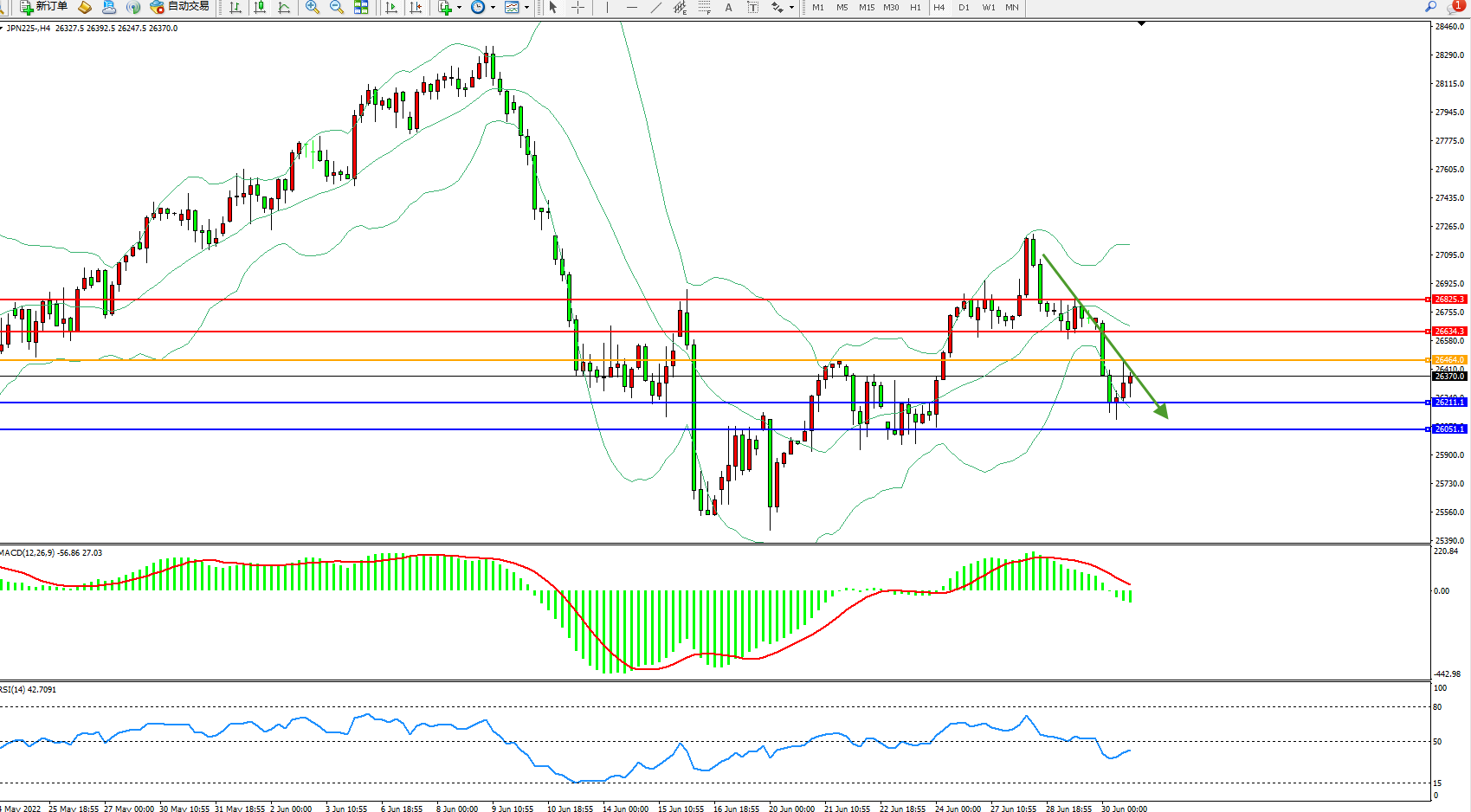 日经225指数6月30日(周四)收盘下跌422.10点,跌幅1.57%,报26382.50点。高盛经济学家认为,到2022年底,日本核心CPI有上升到3%的可能。企业商品价格与CPI之间的通胀率差距已经扩大到“与石油危机(1979—1980年)期间相当”的水平。预计企业整体成本上升将反映在滞后的价格修正中,从而推高CPI。