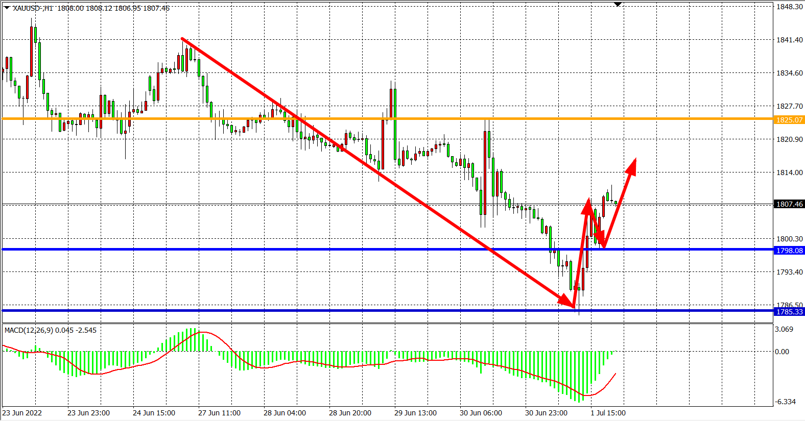 周五(7月1日)美联储多位官员再度明确表态支持加息75个基点,市场对于美联储的加息计价再度上提,美指大幅冲高,黄金最低跌至1785美元附近,随着加息预期重燃,也加剧了投资者对于美国经济可能进一步衰退的担忧,黄金而后收复全部失地,再度走出“V型”反转行情。