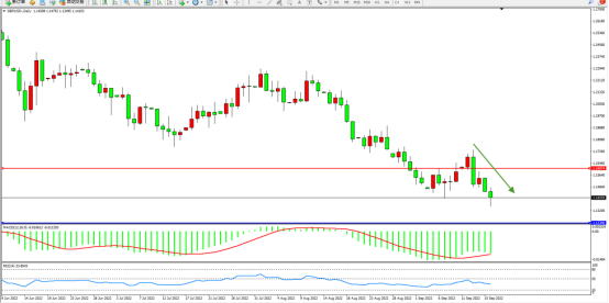 空头动力维持震荡下行,低位短期空头情绪持续,有继续向下移动态势,上方压制关注1.16074附近,低位支撑关注1.12340附近,MACD指标处于空头区域整理,RSI指标处于50均衡线下侧徘徊,如图: