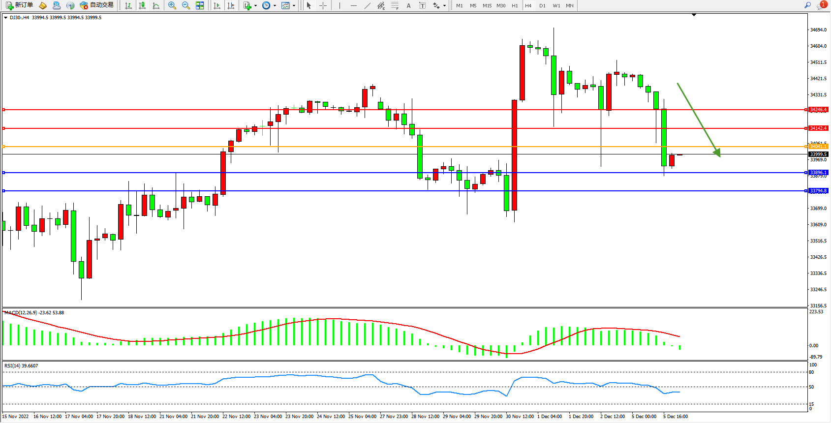 道琼斯指数12月5日(周一)收盘下跌483.37点,跌幅1.40%,报33946.51点;美国11月ISM非制造业PMI上升至56.5,美联储在收紧加息周期的道路上依然任重道远,市场仍相信美联储不会在2023年降息。