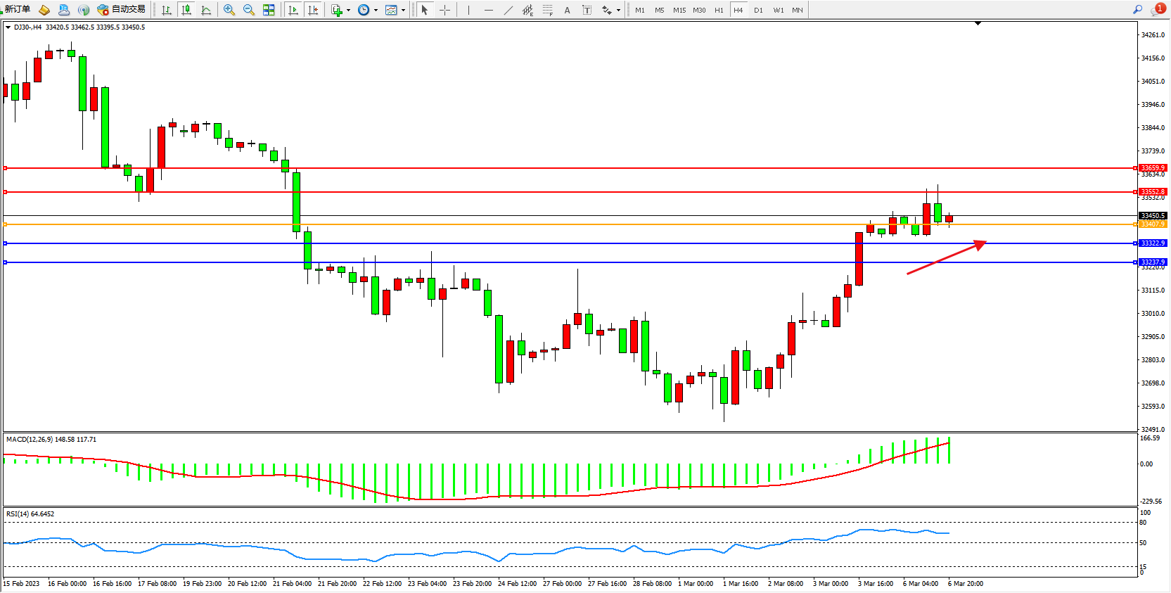 道琼斯指数3月6日(周一)收盘上涨40.08点,涨幅0.12%,报33431.05点;投资者等待美联储主席鲍威尔即将在国会发表的证词以及美国劳工部即将发布的2月非农就业报告,可能影响美联储加息前景。