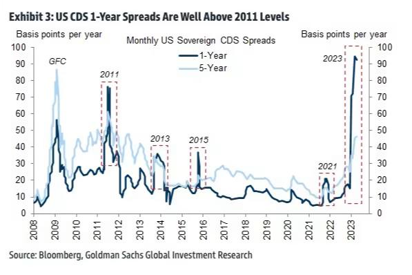 正处于10年高位的美国主权信用违约掉期(CDS)价格预示着投资者愈发担忧几个月后美国政府的违约风险。