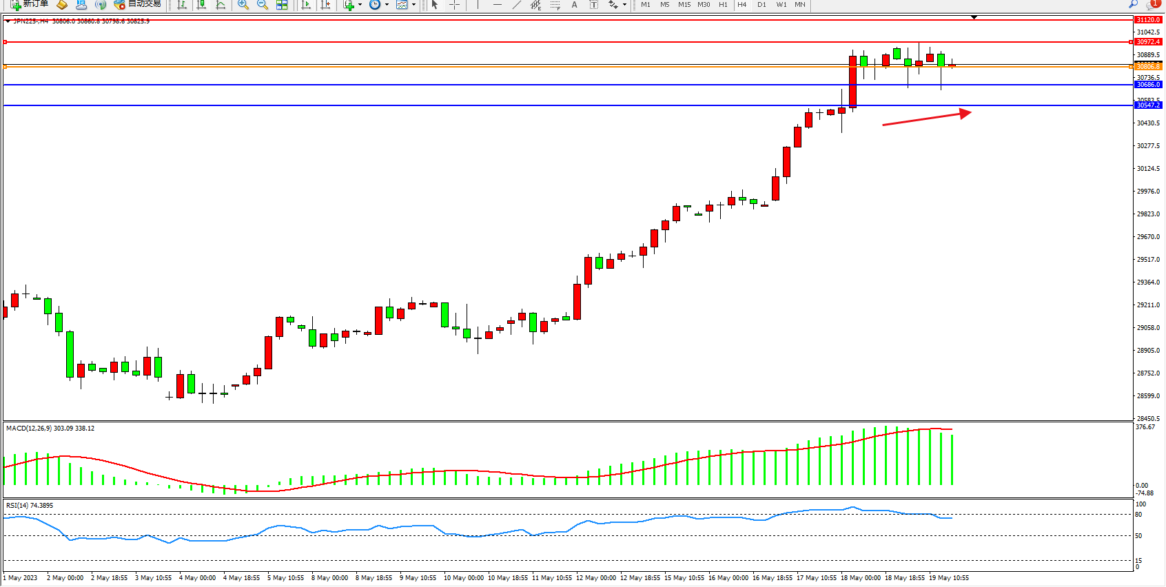 日经225指数5月19日(周五)收盘上涨248.57点,涨幅0.81%,报30822.50点。日本股市连续第7日走高,日经225指数今日收涨0.81%报30819.79点,为1990年7月以来新高,年内累涨18%。日本股市是今年亚洲表现最好的市场。本股市今年的涨势将延续下去,因盈利增长、股票回购和估值仍处于低位吸引了买家。巴菲特的认可、公司治理的改善提振了日本股市,而企业财报的表现或成为最新的催化剂。