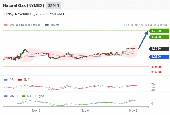 Natural Gas (NYMEX) (DEC5) 当日内: 看涨,当 4.2500 为支撑位,目标定在4.7200。